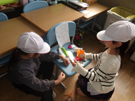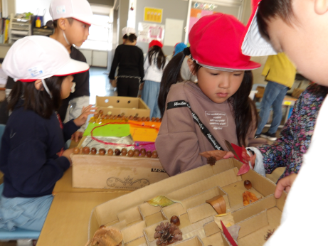 1年生は、久米幼稚園・久米保育園の年長児を招待して、あきのものでつくったおもちゃ屋さんを開店しました。