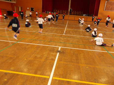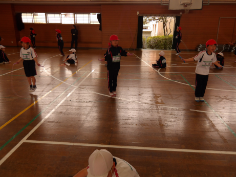 まずは、個人でのなわとびの挑戦です。子どもたちは、前とびや後ろとびなど、6つの種目に一生懸命取り組みました。練習の成果を発揮しようと、あきらめずに挑戦する姿がたくさん見られました。